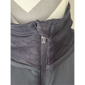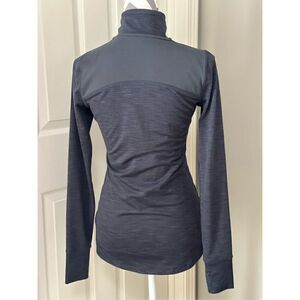 Great ladies quarter zip long sleeve running pullover in size XS. Mesh yoke, zipper cover at closure, higher neck. Nice weight and stretch to this with polyester spandex blend fabric. Long sleeve with thumb holes. High low hem. Bluish gray striated fabric pattern. Like new, no tags. Orig $60