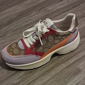 Stylish Coach sneakers with pink and purple accents. Comfortable and trendy for everyday wear. Women's Coach Sneakers like new, never worn outside, only tried on. Size 7. Coach Yes'!