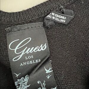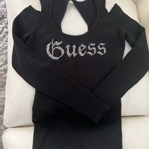Elegant black cold-shoulder long sleeve top featuring the iconic Guess rhinestone logo on the front. Fitted silhouette with a flattering stretch—perfect for a chic casual or dressed-up look.