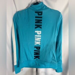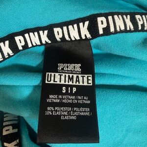 Teal fabric with black and white branded trim. Comfortable and stylish.