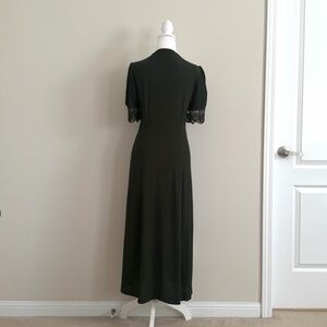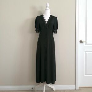 Dark green maxi dress with a full button-down front and delicate lace detailing throughout. Features short, slightly puffed sleeves and a flowing silhouette that gives it a refined, vintage-inspired feel. An easy, elegant piece that can be dressed up or worn casually while still feeling polished and timeless.