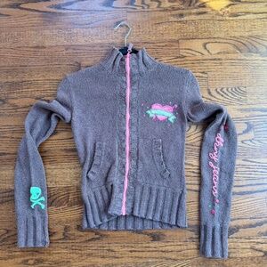 Brown & pink zip up sweater with skull and heart details. has a crop fit. tagged a size small, runs smaller in my opinion