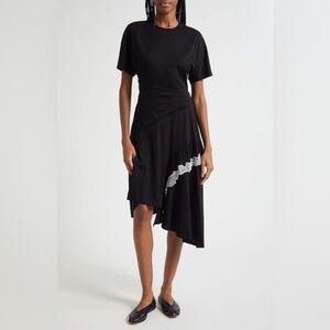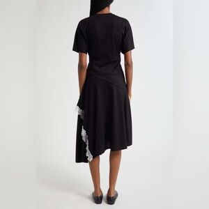 Effortless meets elevated. This short sleeve midi dress is crafted from soft cotton jersey, designed with an asymmetric silhouette and subtle lace trim that accents the skirt I houghttul draping through the waist tatters the torm, offering the ease of a tee with just the right dose of sophistication. Style it with heels, flats, or boots—It goes wherever the day takes you.