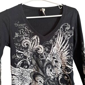 Keywords: Ransom, graphic tee, festival, baddie, goth, Y2K, long sleeve, v neck, fleur de lis, wings, rebel, rock, gothic, edgy, alternative, statement, streetwear, casual