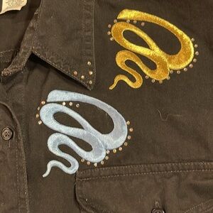 Vintage 22nd Terrace black denim long-sleeve shirt featuring bold embroidered squiggle designs in gold, blue, and silver, accented with rhinestone details for subtle sparkle.