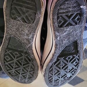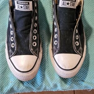 Black Converse slip-on sneakers with white accents. Comfortable and stylish.
