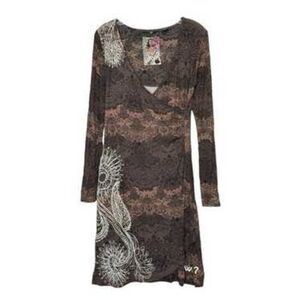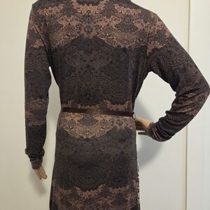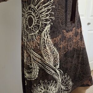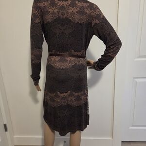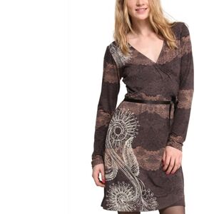 Step out in style with this elegant brown wrap dress, featuring intricate patterns for a sophisticated look. Perfect for any occasion.