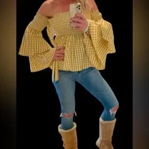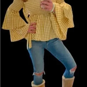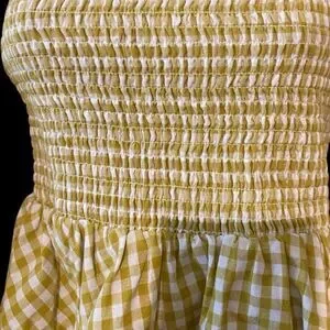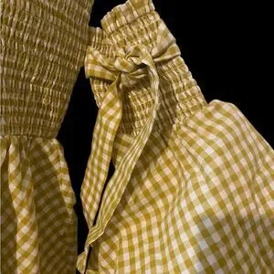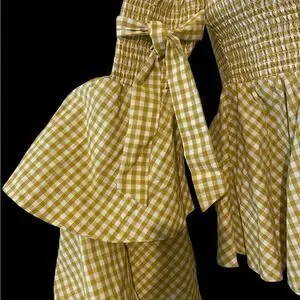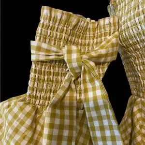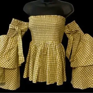 This is a beautiful Caroline Constas Appolonia top that features a smocked bodice and a flared hem. The long sleeves have wide, ruffled cuffs, adding to the top's distinctive style. The gingham pattern and off-the-shoulder design are characteristic of Caroline Constas's aesthetic, which is inspired by travel and emphasizes wearable, lightweight cotton fabrics. The top is made of 100% cotton and retails for $420. It is new without tags. Smoke free home.