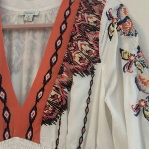 Chic high low dress with pink embroidery. Features a flowing silhouette. Ideal for stylish outings.Sundance Amrita Story White Folklore Midi Dress Size Medium