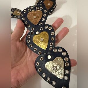 Condition: Nice condition with signs of wear. The leather is soft and supple. No missing hardware, so some of the attached hearts are bit bent they are all intact. Overall very nice wearable condition.