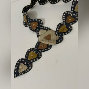 Gorgeous and unusual vintage handmade dark blue leather and eyelets and metal hearts adjustable belt. The buckle matches the rest of the belt and fits into the eyelets to make it adjustable. The whole thing is really sweet and many ways to style.