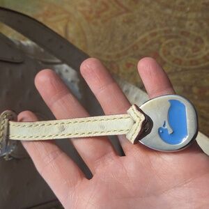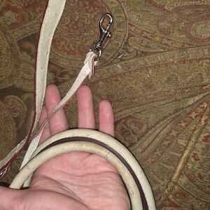 Vintage Dooney&Bourke cream ostrich embossed leather crossbody satchel. $398 retail. Blue duck charm, crossbody strap, and attached key fob leash included. Silver hardware. Push lock clasp closure. Cream/white canvas lining. Purse measures approximately 13 inches across by 7 inches high and 4.5 inches wide. Crossbody strap drop is approximately 16 inches. Double top handle strap drop is approximately 5 inches. Call outs: Minor top handle wear, a few minor marks/spots on interior lining. No rips or tears. Faint odor from use or storage. Comes from smoke free and cat friendly home. Accepting offers and counteroffers!