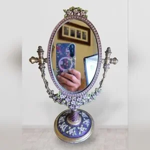 Elegant oval mirror with intricate floral design made by Two's Company. Features purple and gold tone accents, rhinestone and brass. Perfect for adding a vintage touch to any room. Pre-loved by in great condition.