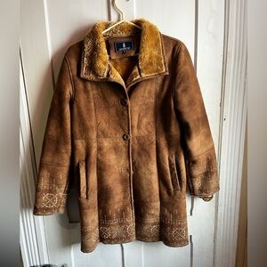 London Fog Faux Shearling coat-Brown Suede w/embroidered Trim & plush lining
