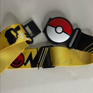 Official Pokémon Clip 'N' Go wristband featuring a central Poké Ball design and adjustable yellow strap with black buckles. Includes stylized graphics and a red smiley face emblem.