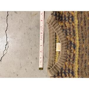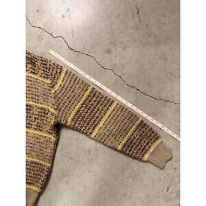 Cozy up in this vintage Bullocks Wilshire crew neck sweater! Featuring a warm, earthy color palette with shades of beige, brown, and yellow in a textured knit pattern.