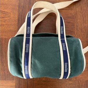 Green canvas mini duffle bag with navy and cream straps
