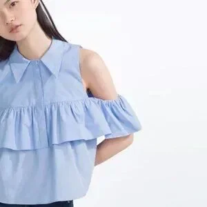Zara blue ruffle button up off the shoulder top women's