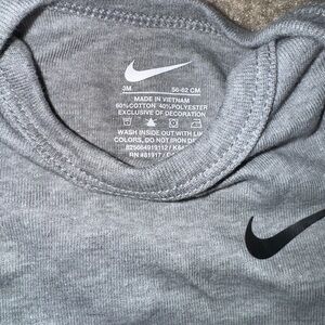 Set of 4 Nike onsies in gray, white, black, and navy blue.
