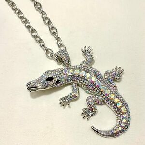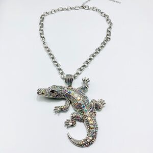 Bold sparkly large Alligator reptile rhinestone silver-tone statement necklace