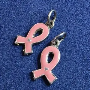 Pair of pink awareness ribbon charms with silver accents. Perfect for jewelry making or as a thoughtful gift.
