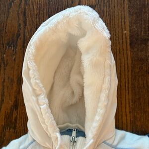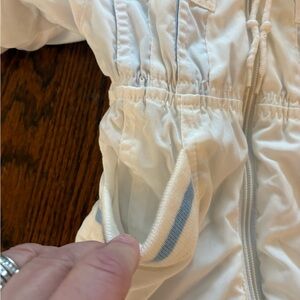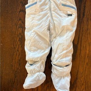 Super nice vintage snowsuit. Detachable feet. Full zip. White colored. Baby blue leather bed. Furry warm hood. Front pockets. Gently used