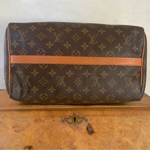 Fantastic and full of character, this French Company Speedy 30 is so special! The canvas is in beautiful condition. Vachetta is a rich Carmel color. Handles have darkened with use, but are in great shape. Hardware has tarnished, and shows its history, but works well. The piping, while having some scuffs, is solid, with no splitting/ cracking. Interior is clean and fresh, with no flaws to mention. The leather where the handles attached to the bag is starting to demonstrate some splitting (picture #14-16), but is still sturdy with no threat of coming apart. Stitching throughout is near perfect. I have loved this bag so much, (French company LV is some of my favorite) but I think it’s time to rehome it to someone who will carry it more often. Bag has been babied, stuffed, and kept a generic dust bag out of the light.