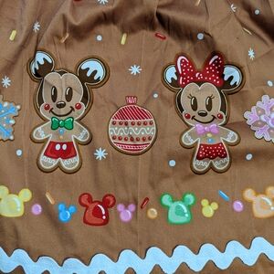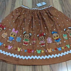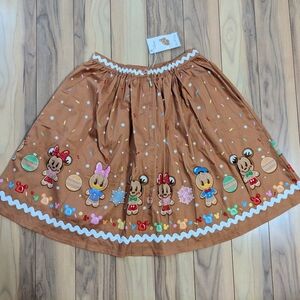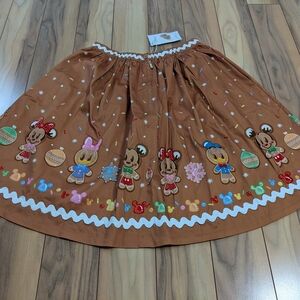NWT! Loungefly The Stitch Shoppe Gingerbread Friends Sandy Skirt, women's Size M. Beautiful! This skirt is a fantastic wear for a fun holiday event or an upcoming trip to Disney. It is a dark tan color with an images of Mickey, Minnie, and Donald as gingerbread around the bottom. There is a zip and button closure in the back. It comes with the pin accessory on the tag. Measurements are shown in the photos. It comes from a smoke and pet free home. No defects found upon final inspection. Message me if you have any questions. Enjoy!