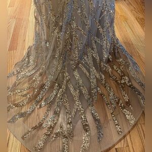 This stunning off-shoulder wedding dress features a shimmering gold design, perfect for making a statement on your special day. The intricate detailing adds a touch of elegance and sophistication. Alexander By Daymore off the shoulder gown with embellished tulle over a solid lining with sweetheart neck. Has a wide v back, horsehair hem and a sweep train