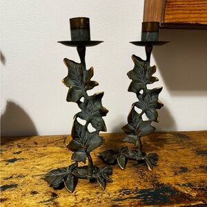 Enhance your home decor with these elegant lPartylite verdigris ivy leaf design candle holders. The intricate green and gold finish adds a touch of nature and luxury to any room. 8.75” tall x 4” wide.