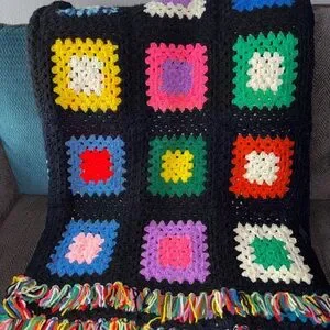 Vibrant crochet blanket with multicolor granny squares. Features black, yellow, pink, green, red, purple, and white squares. Perfect for adding a pop of color to any room.