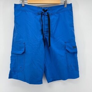 True Religion men's royal blue cargo board shorts. These versatile swim trunks feature a comfortable drawstring waist and practical cargo pockets on both sides. The logo is subtly displayed on the right cargo pocket. Perfect for swimming, beach days, or casual summer wear.