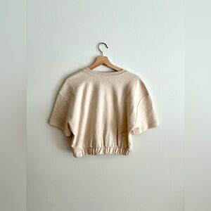 Stylish cream crop top by Zara. Features short sleeves and elastic hem. Ideal for casual wear. Purchased in Spain, tag reflects that price point.
