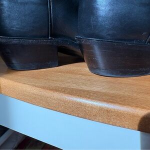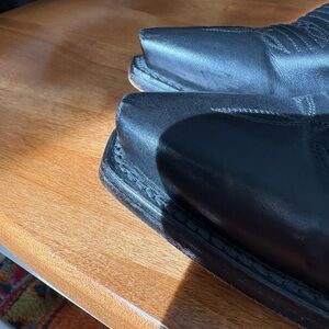 Classic black leather boots with intricate stitching. Perfect for a rugged yet stylish look.