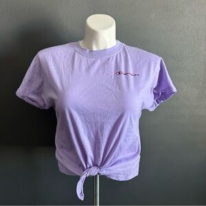 FEATURES: Women's purple pullover top with embroidered logo on the left side. Top has a tie front, short sleeves, crewneck.