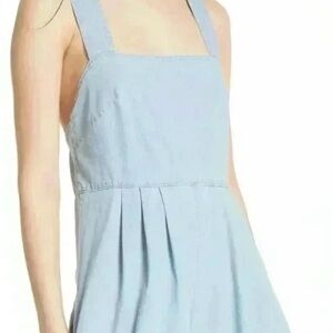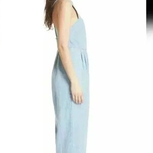 Chic denim blue jumpsuit with wide legs, pockets, side buttons.