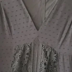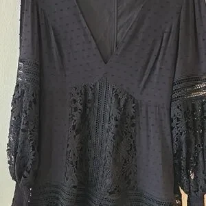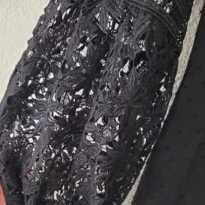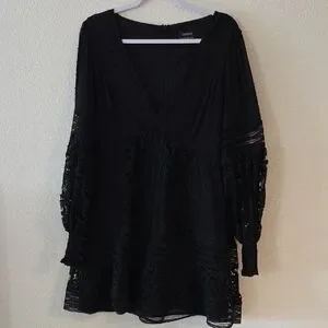 Elegant Bardot mini dress. Features intricate lace details. Long sleeves with a deep V-neckline. Perfect for evening wear.