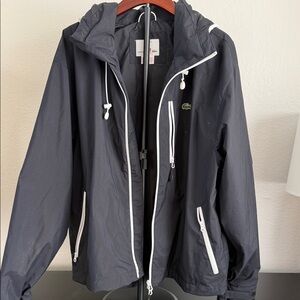 Black utility jacket with white accents. Features a hood and zippered pockets. Rain resistant, wind proof, Ideal for versatile wear. Size 56 Euro slim fit.