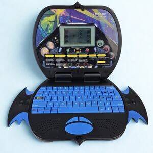 Produced by Oregon Scientific under official Batman licensing, this unit features a fold-out laptop design with a built-in screen, full keyboard, and themed interface inspired by Gotham City. It includes multiple learning categories such as math, word games, memory, logic, and music—making it both a functional educational device and a display-worthy collectible.