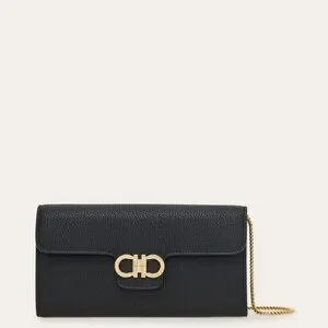 Effortlessly chic and endlessly versatile, this grained calfskin wallet comes with a sleek chain, transforming it into a stylish mini bag. The contrast-color interior is designed for perfect organization, featuring card slots, bill compartments, and a central zipped pocket for coins. A gold-tone Gancini buckle on the front flap adds the perfect finishing touch.