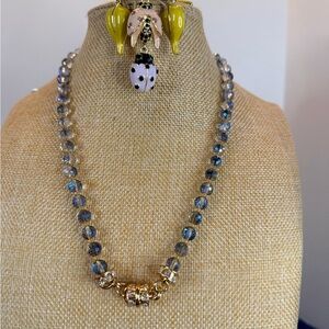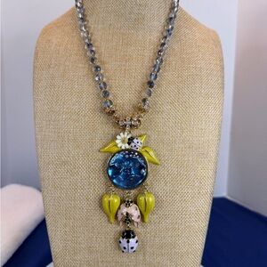 Kirk’s Folly Charming necklace with a blue crystals with rhinestones front closure. Yellow accents, white daisy and pink ladybugs. Features playful charm details.