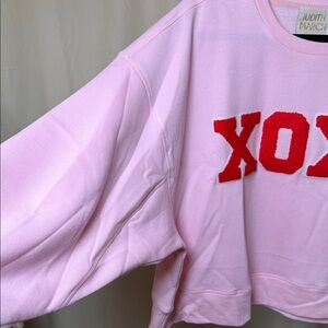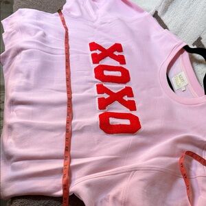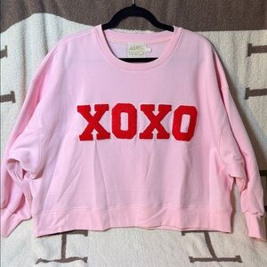 Judith March Cozy pink sweatshirt featuring bold red XOXO lettering.