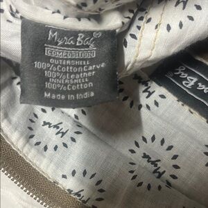 This handbag is a Myra Bag crossbody or shoulder bag. The brand uses upcycled canvas and genuine cowhide or leather accents to create unique, bohemian-style products. The specific design features a blue and white patterned fabric panel and a brown cowhide panel.