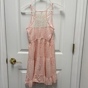 Adorable light pink dress with delicate patterns. Features a sleeveless design and ruffled hem. Ideal for casual outings.