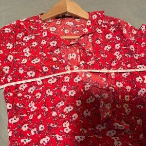Super flattering three-quarter sleeve wrapped dress in a gorgeous read with a blue and whitefloral pattern. Very lightweight and versatile can be worn, dressed up with heels or more casually with sneakers and low heeled sandals. I have gotten tons of compliments on this stress, but it’s time to rotate for something new. Please see photos for measurements. I’m 5 foot eight and it hits me just above the knee in the front but it’s a couple of inches longer in the back. Because it’s a rap dress, there would be a range of fit in the measurement. No visible signs of where and it is clean. Purchased at The Bay…