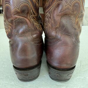 These Justin Western Cowboy Leather Boots in size 11 feature a pointed toe shape and a pull-on closure for easy wear. Made from dark brown leather with embroidered accents, these boots are perfect for various occasions such as travel, weddings, parties, and casual wear. With a mid-calf shaft style and a D width, these boots exude a classic Western cowboy theme and are ideal for all seasons. Crafted by Justin Boots, they are a stylish and durable choice for any man looking for a high-quality leather boot.