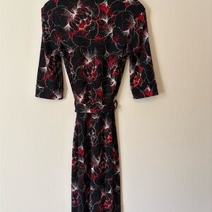 Elevate your wardrobe with this chic mid-sleeve floral dress. The striking black and red design offers a sophisticated look for any occasion. Buttoned on top, belted. Size medium