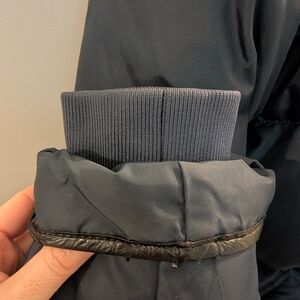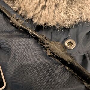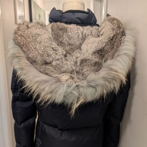 Elegant dark blue puffer with real fur hood. Ideal for cold weather.