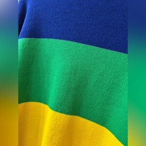 Vibrant sweater featuring Snoopy. Bold stripes in blue, green, yellow, and red. Comfortable and stylish.