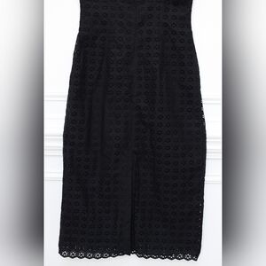 Black eyelet lace, midi, sheath, tie front bodice with keyhole, spaghetti straps, scalloped hem, back slit, back zip closure, lined